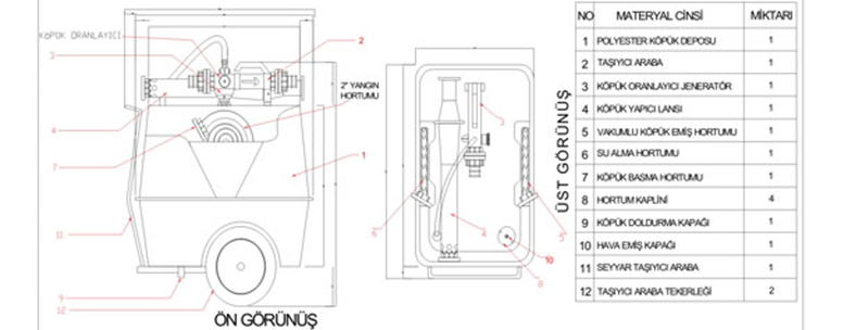 120 lt köpük taşıma haznesi olup köpük lansı ve jeneratörü ile birlikte kullanılmaktadır. Köpük jeneratörünün üzerinde %1-7 arasında oranlayıcı bulunmaktadır. Indüktörlü jeneratörler köpük üretmek için en basit ve en etkin sistem olup her oranda köpük konsantrasyonu ile kullanılır. Köpük jeneratörü vakum sistemi ile karışım sağlar ve % 1-7 indiksiyon oranında su+köpük karışımın oluşturur. Köpük deposu polyester olup korozif etkisi yoktur. Polyester deponun her iki tarafında 2 top hortum bölümü bulunmaktadır. Seyyar taşıyıcı arabası ile kolayca hareket ettirilerek kısa sürede yangına müdahale edilir. | ||